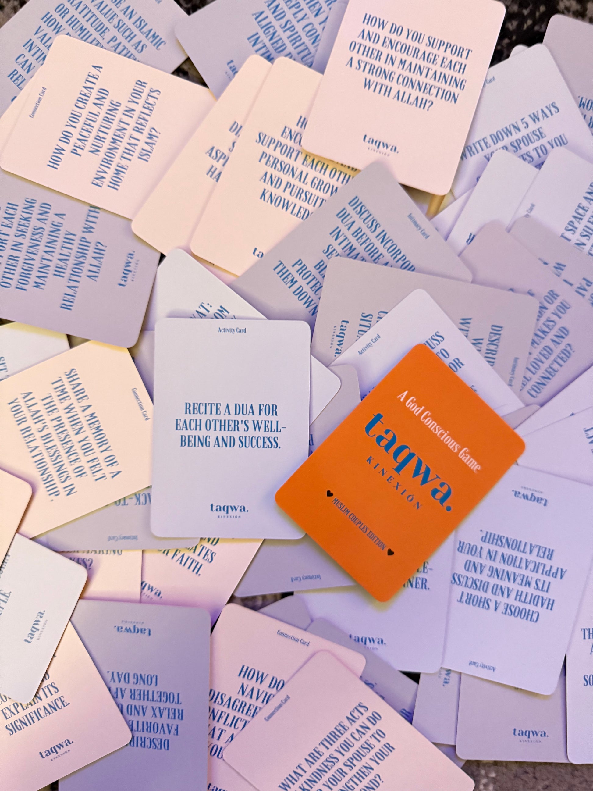 Introducing the first ever Muslim Couple Card Game "Taqwa KINEXIÓN: Strengthening Bonds and Deen" – the ultimate Muslim card game designed exclusively for married couples seeking to deepen their connection and strengthen their relationship through meaningful conversations, engaging activities, and fostering a strong sense of faith.